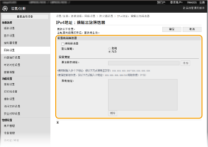 2 | 指定例外地址。 在 [要注册的地址] 文本框中输入 IP 地址(或 IP 地址范围),然后单击 [添加]。 检查是否有输入错误 IP 地址输入形式 | 说明 | 示例 | 输入单个地址 | IPv4: 用点分隔数字。 | 192.168.0.10 | IPv6: 用冒号分隔字母数字字符。 | fe80::10 | 指定地址范围 | 在地址之间插入连字符。 | 192.168.0.10-192.168.0.20 | 指定具有前缀的地址范围 | 输入地址,然后输入斜杠和表示前缀长度的数字。 | 192.168.0.32/27