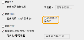 1 | 选择 [使用TTLS] 或 [使用PEAP] 复选框。 用于 TTLS 的内部协议 可以选择 MSCHAPv2 或 PAP。 |