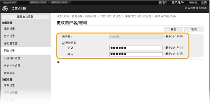 3 | 设置用户名/密码。 [用户名] 输入字母数字字符的用户名。 [更改密码] 要设置或更改密码,请选中此复选框并在 [密码] 和 [确认] 文本框中输入字母数字字符的新密码。 |