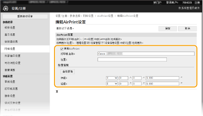 可以检查 AirPrint 设置中输入的值,例如本机的名称和位置。您可以单击 [编辑] 更改设置。