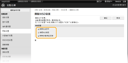 2 | 根据需要配置设置。 ![]() [使用WSD打印] 选择此复选框可通过 WSD 打印。不使用 WSD 打印时,请取消选中此复选框。 [使用WSD浏览] 选择此复选框可通过 WSD 从计算机获取关于本机的信息。当选择 [使用WSD打印] 复选框时,将自动选择此复选框。 [使用多路传送发现] 选择此复选框可将本机设置为回复多路传送发现消息。如果取消选择此复选框,即使多路传送发现消息在网络上传播,本机也将保持睡眠模式。 |