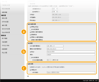 2 | 配置 IPv4 DNS 设置。 ![]() [DHCP选项设置][获取主机名] 选择此复选框可启用选项 12 从 DHCP 服务器获得主机名。 [DNS动态更新] 选择此复选框可启用选项 81 通过 DHCP 服务器动态更新 DNS 记录。 [获取DNS服务器地址] 选中此复选框可启用选项 6 从 DHCP 服务器获得 DNS 服务器地址。 [获取域名] 选中此复选框可启用选项 15 从 DHCP 服务器获得域名。 [获取WINS服务器地址] 选中此复选框可启用选项 44 从 DHCP 服务器获得 WINS 服务器地址。 [获取POP服务器地址] 选中此复选框可启用选项 70 从 DHCP 服务器获得 POP3 服务器地址。 [DNS设置][主DNS服务器地址] 输入 DNS 服务器的 IP 地址。 [辅助DNS服务器地址] 如果有辅助 DNS 服务器,请输入其 IP 地址。 [主机名] 为要注册到 DNS 服务器的本机主机名输入字母数字字符。 [域名] 为本机所属的域名输入字母数字字符,例如“example.com”。 [DNS动态更新] 选中该复选框可在本机的 IP 地址更改时动态更新 DNS 记录。指定更新间隔时,请在 [DNS动态更新间隔] 文本框中以小时为单位输入时间。 [mDNS设置][使用mDNS] 被 Bonjour 采用,mDNS(多路传送 DNS)是用于不通过 DNS 将主机名与 IP 地址相关联的协议。选择此复选框启用 mDNS,然后在 [mDNS名称] 文本框中输入 mDNS 名称。 |