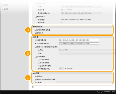 2 | 配置 IPv6 DNS 设置。 必须选择 [使用IPv6] 复选框才能配置设置。设置 IPv6 地址 ![]() [DHCP选项设置][获取DNS服务器地址] 选中此复选框可启用选项 23 从 DHCP 服务器获得 DNS 服务器地址。 [获取域名] 选中此复选框可启用选项 24 从 DHCP 服务器获得域名。 [DNS设置][主DNS服务器地址] 输入 DNS 服务器的 IP 地址。无法输入以“ff”开头的地址(或多路传送地址)。 [辅助DNS服务器地址] 如果有辅助 DNS 服务器,请输入其 IP 地址。无法输入以“ff”开头的地址(或多路传送地址)。 [使用与IPv4相同的主机名/域名] 选择此复选框可使用与 IPv4 中相同的主机名和域名。 [主机名] 为要注册到 DNS 服务器的本机主机名输入字母数字字符。 [域名] 为本机所属的域名输入字母数字字符,例如“example.com”。 [DNS动态更新] 选中该复选框可在本机的 IP 地址更改时动态更新 DNS 记录。若要指定想要注册到 DNS 服务器的地址类型,请选中 [注册手动地址]、[注册状态地址] 或 [注册无状态地址] 的复选框。若要指定更新间隔,请在 [DNS动态更新间隔] 文本框中以小时为单位输入时间。 [mDNS设置][使用mDNS] 被 Bonjour 采用,mDNS(多路传送 DNS)是用于不通过 DNS 将主机名与 IP 地址相关联的协议。选择此复选框可启用 mDNS。 [使用与IPv4相同的mDNS名称] 选择此复选框可使用与 IPv4 中相同的 mDNS 名称。若要设置不同名称,请取消选中此复选框,然后在 [mDNS名称] 文本框中输入 mDNS 名称。 |