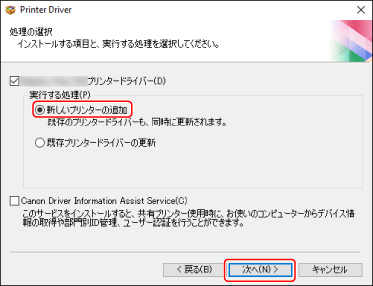[既存プリンタードライバーの更新]:ドライバーの更新だけを行う場合に選択してください。選択した場合は、次に表示される画面で[更新するプリンターの選択]をクリック → [プリンター一覧]から更新するデバイスを選択 → [OK]をクリックします。表示された画面で[開始]をクリックし、手順
