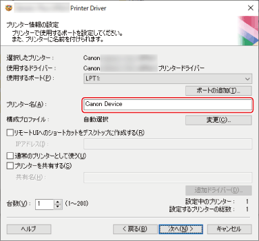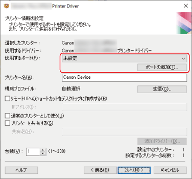 ネットワークプリンター用ポートを選択した場合は、[プリンター名]および[プリンターを共有する]を設定できません。