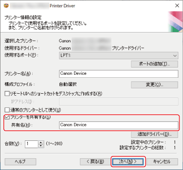 [プリンターを共有する]を選択 → 必要に応じて[共有名]を変更 → [次へ]をクリック