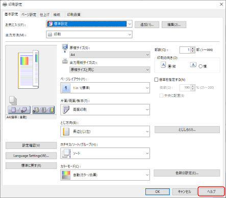 ヘルプは、ドライバーの印刷設定画面にある[ヘルプ]をクリックして表示します。