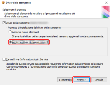 Selezionare [Aggiorna driver di stampa esistenti] → fare clic su [Avanti].