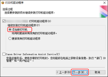 [更新现有打印机驱动程序]:仅当要更新驱动程序时选择该选项。选择该选项之后,在下一个屏幕中单击[选择要更新的打印机] → 从[打印机列表]中选择要更新的设备 → 单击[确定],然后单击[开始] → 跳到步骤