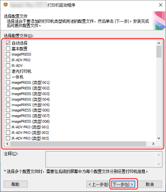 须知如果设备连接到所用计算机,则通常设置[自动选择]。如果计算机不能连接到设备并且不能检索设备信息,或者必须自定义配置文件,才手动选择配置文件。