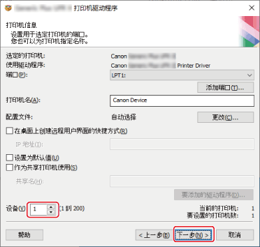 单击 [下一步] 后,对 [设备] 的更改将应用于 [当前的打印机] 和 [要设置的打印机数]。