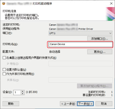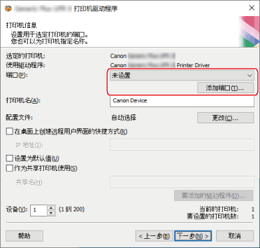 如果选择了网络打印机端口,则无法设置 [打印机名] 和 [作为共享打印机使用]。
