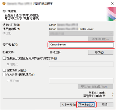 如果要更改设备名称,将其设置为默认设备,或更改配置文件,请选择[设置打印机信息] → 单击[下一步]。