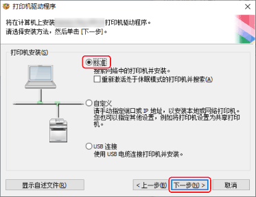 [再次搜索]:如果设备未显示在 [打印机列表] 中,可单击此项。如果重新搜索后设备仍未显示,可选择 [自定义] 并指定一个端口或 IP 地址进行安装。