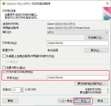 选择[作为共享打印机使用] →更改[共享名](如有必要)→单击[下一步]。