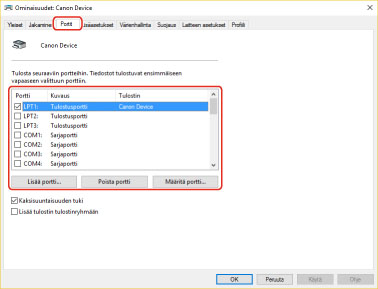 Jos määrität laitteen portin väliaikaisesti ajuria asentaessasi, valitse oikea portti noudattamalla näitä ohjeita.