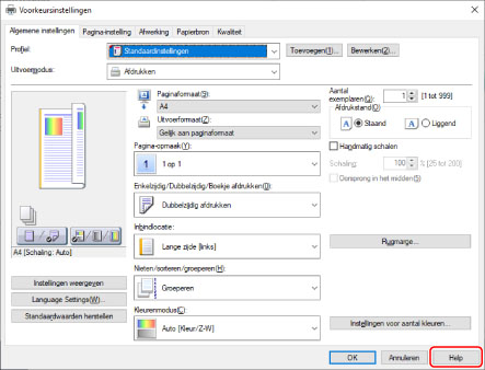 De helpfunctie wordt weergegeven door op [Help] te klikken in het scherm met afdrukinstellingen van het stuurprogramma.