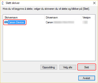 [Opprydning]: Klikk på denne for samtidig å slette alle filer og all registerinformasjon relatert til alle driverne som vises i listen, ikke bare den valgte driveren. Klikk på [Slett] for å utføre en normal avinstallering av driveren.