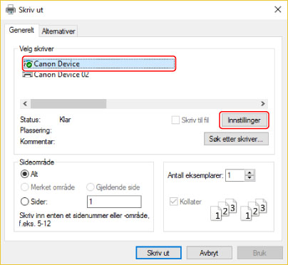 Avhengig av hvilken applikasjon du bruker, kan [Innstillinger] hete "Skriveregenskaper" eller "Egenskaper".