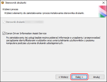 [Canon Driver Information Assist Service]: wybierz tę opcję, aby korzystać z funkcji uzyskiwania informacji o urządzeniu w środowisku serwera druku.