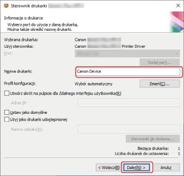 Aby zmienić nazwę urządzenia, ustawić je jako domyślne lub zmienić profil konfiguracji, wybierz opcję [Ustaw informacje o drukarce] → kliknij przycisk [Dalej].