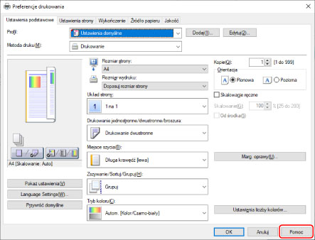 Pomoc jest wyświetlana po kliknięciu opcji [Pomoc] na ekranie ustawień drukowania sterownika.
