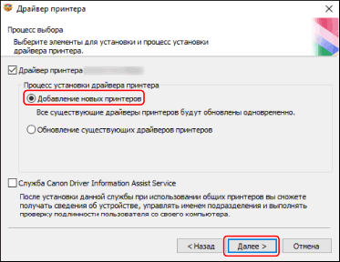 11.[Сanon Driver Information Assist Service]: выберите этот вариант, когда требуется использовать функцию получения информации об устройстве в среде сервера печати.