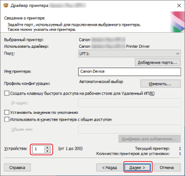6.При нажатии кнопки [Далее] изменение в поле [Устройства] применяется к полям [Текущий принтер] и [Количество принтеров для установки].