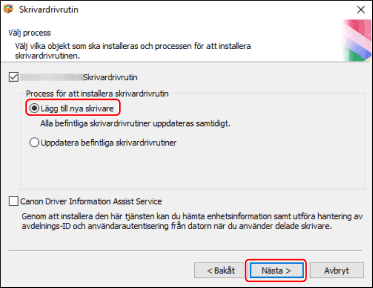 11.[Canon Driver Information Assist Service]: Välj detta när du vill använda funktionen för hämtning av enhetsinformation i en skrivarservermiljö.