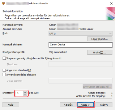 6.När du klickar på [Nästa] aktiveras ändringen i [Enheter] för [Aktuell skrivare] och [Antal skrivare för omgång].