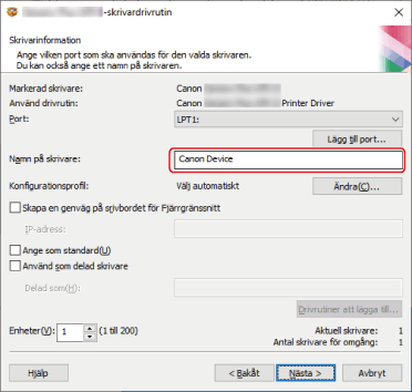Om du har valt en nätverksskrivarport kan du inte ange [Namn på skrivare] och [Använd som delad skrivare].