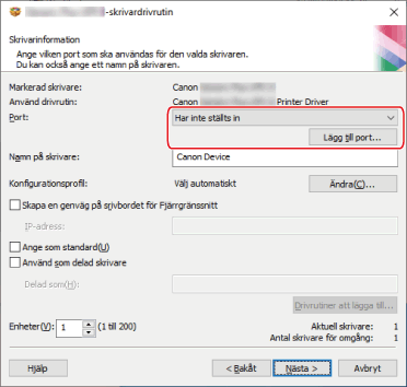 Ange en nätverksport (TCP/IP-standardport eller WSD-port) eller en lokal port. Du kan ange en port som redan är registrerad. Du kan välja en tillfällig port ([LPT1] osv.) och ställa in den när installationen är klar.