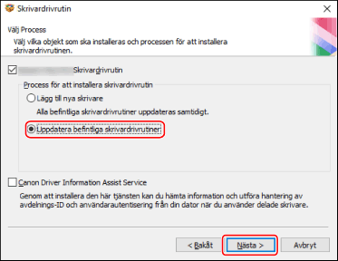 Välj [Uppdatera befintliga skrivardrivrutiner] → klicka på [Nästa].