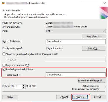 Välj [Använd som delad skrivare] → byt [Delad som] om nödvändigt → klicka på [Nästa].