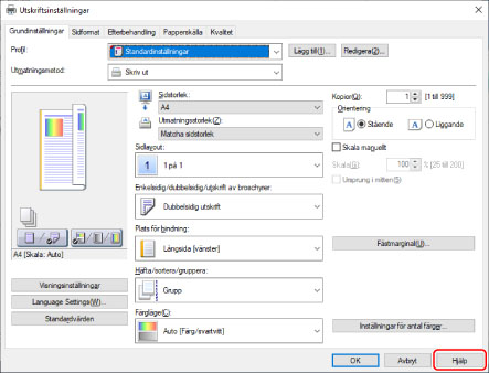 Du visar hjälpen genom att klicka på [Hjälp] på utskriftsinställningsskärmen för drivrutinen.