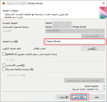 إذا كنت تريد تغيير اسم الجهاز أو ضبط الجهاز كجهاز افتراضي أو تغيير ملف تعريف الإعدادات، اختر [تعيين معلومات الطابعة] ← انقر [التالي].