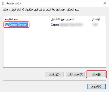[تنظيف]: انقر هنا بشكل متزامن لحذف جميع الملفات ومعلومات السجلات المتعلقة بكل برامج التشغيل المعروضة في القائمة، وليس برنامج التشغيل المختار فقط. انقر [حذف] لإجراء إلغاء التثبيت العادي لبرنامج التشغيل.