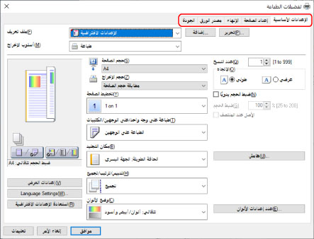 ملاحظةإذا لم يتم عرض الوظيفة التي تريد استخدامها على شاشة إعدادات الطباعة، قم بضبط إعدادات الطباعة بعد تفعيل وظائف الجهاز بالحصول على معلومات الجهاز، الخ.