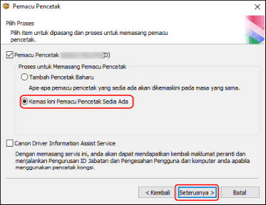 Pilih [Kemas kini Pemacu Pencetak Sedia Ada] → klik [Seterusnya].
