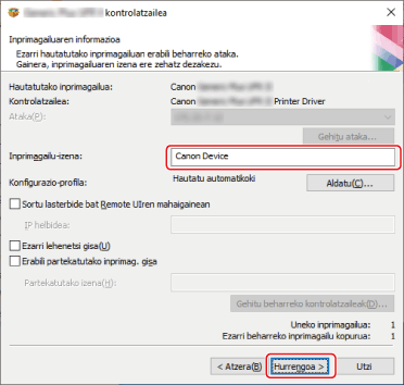 Gailuaren izena aldatu nahi baduzu, gailu lehenetsi gisa ezarri nahi baduzu edo konfigurazio-profila aldatu nahi baduzu, hautatu [Ezarri inprimagailuaren informazioa] → sakatu [Hurrengoa].