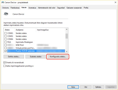 TCP/IP ataka estandarra konfiguratu nahi baduzu, sakatu [Konfiguratu ataka].