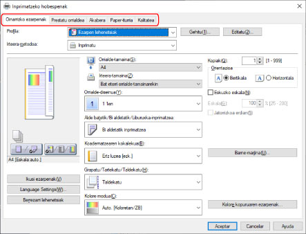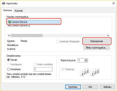 Aplikazioaren arabera, baliteke [Hobespenak] "Inprimagailuaren propietateak" edo "Propietateak" deitzea.