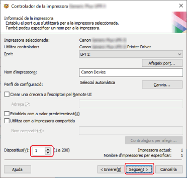 6.En fer clic a [Següent], el canvi a [Dispositius] s’aplica a [Impressora actual] i [Nombre d'impressores per especificar].