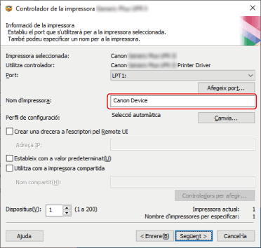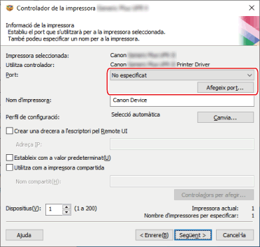 Si heu seleccionat un port d'impressora de xarxa, no podreu configurar el [Nom d'impressora] ni [Utilitza com a impressora compartida].