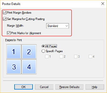 [Poster Details] dialog box: [Print Margin Borders], [Set Margins for Cutting/Pasting], and [Print Marks for Alignment]