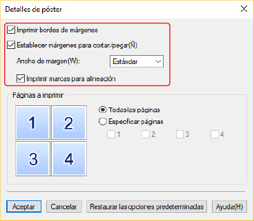 Cuadro de diálogo [Detalles de póster]: [Imprimir bordes de márgenes], [Establecer márgenes para cortar/pegar] y [Imprimir marcas para alineación]