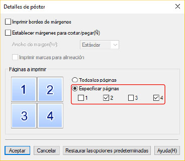 Cuadro de diálogo [Detalles de póster] > [Páginas a imprimir] > [Especificar páginas]: [2] y [4]