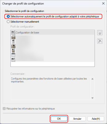 Sélectionnez [Sélectionner automatiquement le profil de configuration adapté à votre périphérique] → cliquez sur [OK].