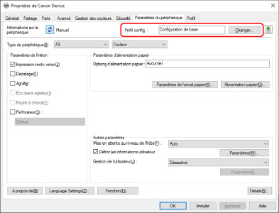 Lors de l'installation, le profil de configuration correspondant au modèle d'imprimante est automatiquement configuré. Avec certains pilotes ou environnements, la fonction d'acquisition des informations relatives au périphérique peut ne pas être prise en charge lorsque le périphérique est connecté par USB. Selon la procédure suivante, vérifiez que le profil de configuration correspondant au modèle d'imprimante est appliqué et configurez manuellement les informations sur les fonctions et les équipements en option du périphérique.
