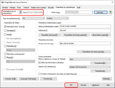 Vérifiez que [Informations sur le périphérique] est défini sur [Auto] → cliquez sur [OK].
